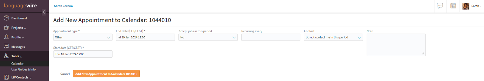 On LanguageWire, you can create a calendar entry when you are unavailable. For instance, when you are on holiday, when you are sick, or when you are too busy to take on new projects.