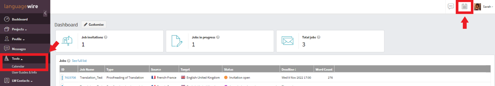 You can access your calendar from either the ‘Tools’ menu or the calendar icon in the upper right corner.