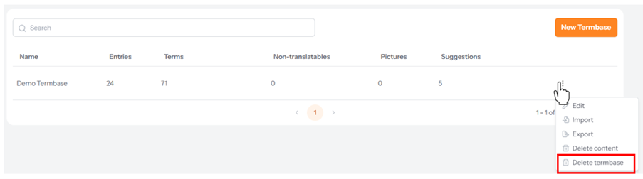 You can delete the entire termbase from the three dots menu in the termbase table.